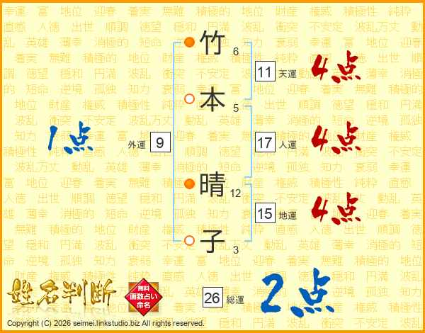 生活面を象徴する運勢です。外部から受ける影響力を表し、結婚運、家庭運や職場、環境への順応性を表します。総運から人運を引いた画数。姓や名が1文字の場合を除く。