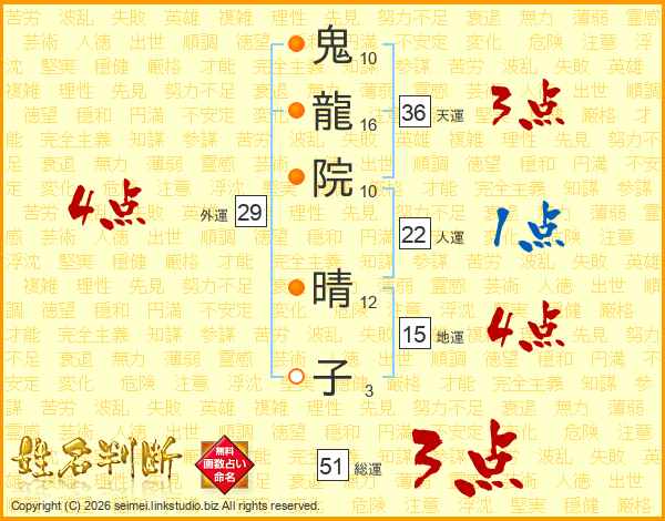 鬼龍院晴子さんの総運は51画の3点!