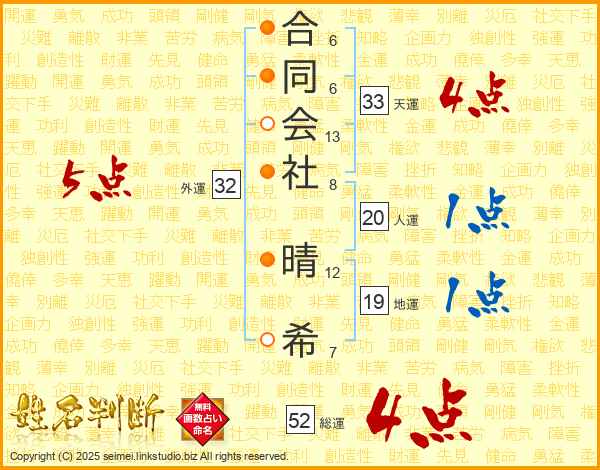 合(6画)同(6画)会(13画)社(8画) 晴(12画)希(7画)