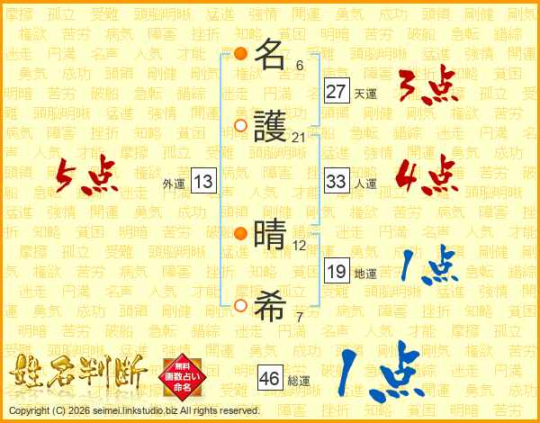 名(6画)護(21画) 晴(12画)希(7画)