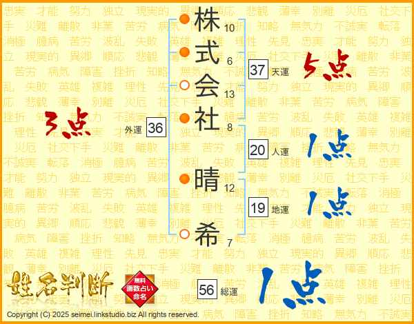 株(10画)式(6画)会(13画)社(8画) 晴(12画)希(7画)