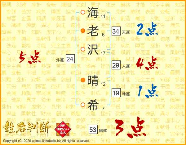 海(11画)老(6画)沢(17画) 晴(12画)希(7画)