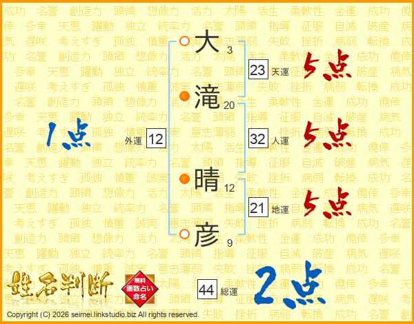 大(3画)滝(20画) 晴(12画)彦(9画)