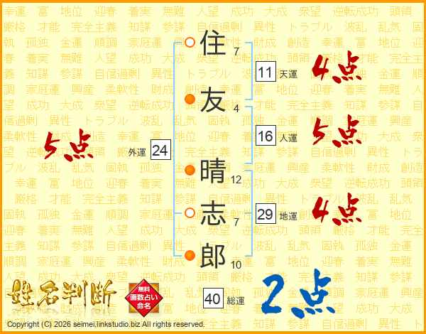 住(7画)友(4画) 晴(12画)志(7画)郎(10画)
