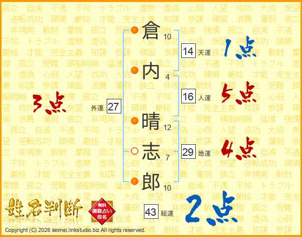 倉(10画)内(4画) 晴(12画)志(7画)郎(10画)