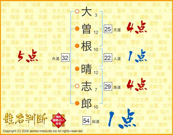 大(3画)曽(12画)根(10画) 晴(12画)志(7画)郎(10画)