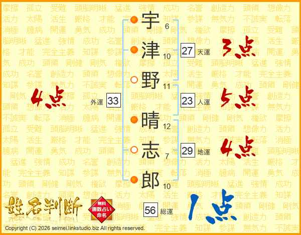 宇(6画)津(10画)野(11画) 晴(12画)志(7画)郎(10画)