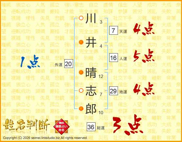 川(3画)井(4画) 晴(12画)志(7画)郎(10画)
