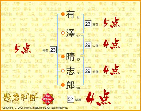 有澤晴志郎さんの総運は52画の4点!