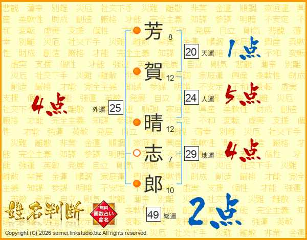 芳(8画)賀(12画) 晴(12画)志(7画)郎(10画)