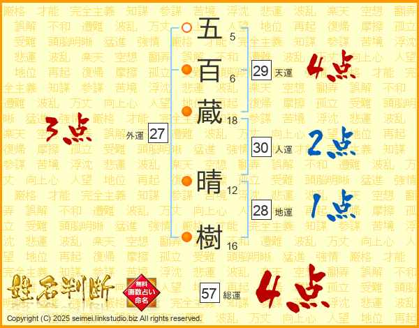 五(5画)百(6画)蔵(18画) 晴(12画)樹(16画)