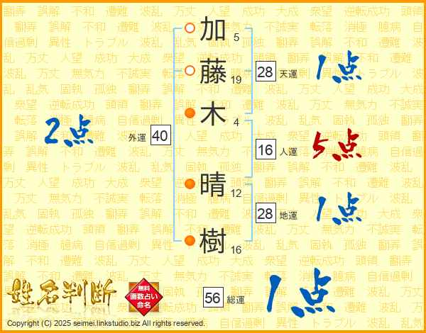加(5画)藤(19画)木(4画) 晴(12画)樹(16画)