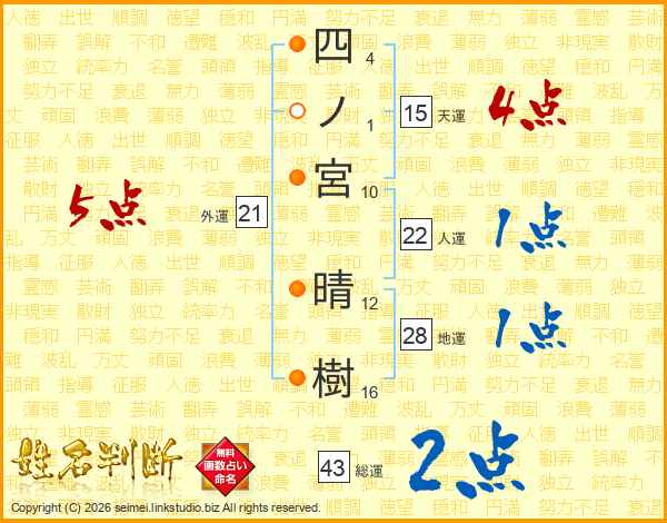 四(4画)ノ(1画)宮(10画) 晴(12画)樹(16画)