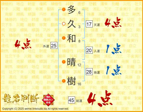 多(6画)久(3画)和(8画) 晴(12画)樹(16画)