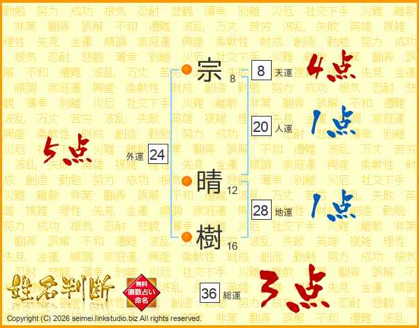 あなたの人生を表す1番重要な運勢です。生涯を通じて影響する総合運となり、主に50歳以降の晩年期に影響を及ぼします。苗字と名前の合計画数。