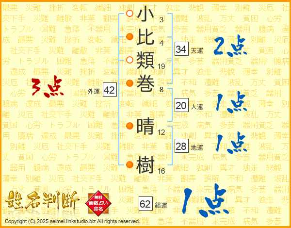 小(3画)比(4画)類(19画)巻(8画) 晴(12画)樹(16画)