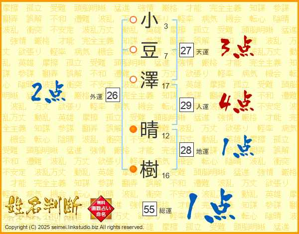 小(3画)豆(7画)澤(17画) 晴(12画)樹(16画)