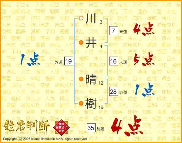 川(3画)井(4画) 晴(12画)樹(16画)