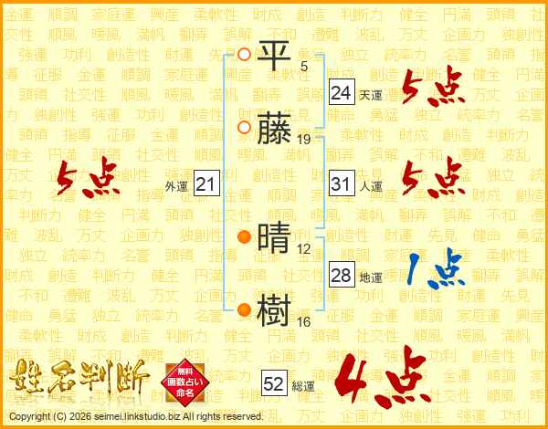 平(5画)藤(19画) 晴(12画)樹(16画)