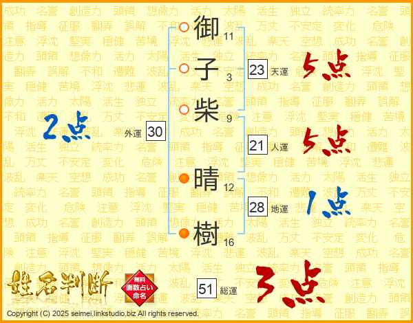 御(11画)子(3画)柴(9画) 晴(12画)樹(16画)