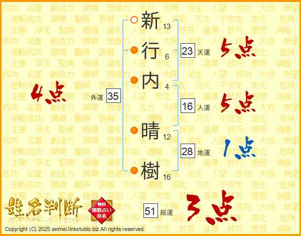 新(13画)行(6画)内(4画) 晴(12画)樹(16画)