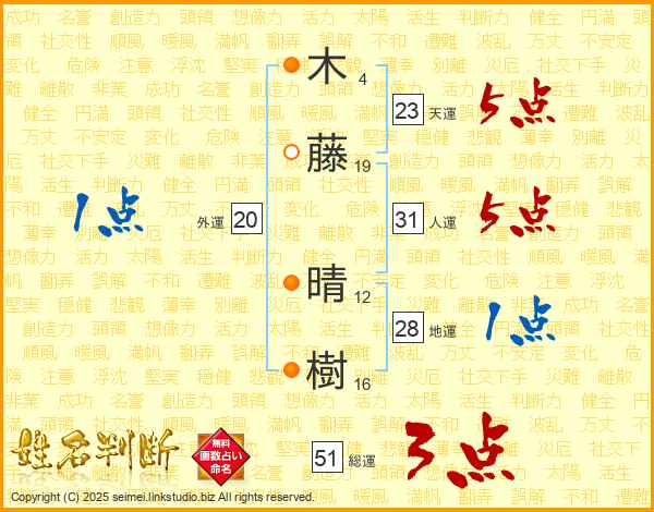 木(4画)藤(19画) 晴(12画)樹(16画)