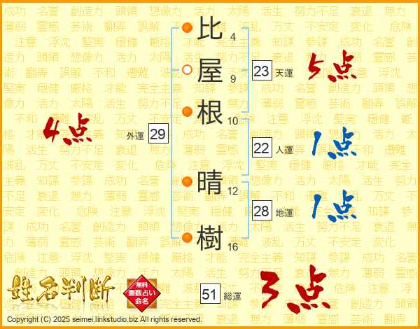 比(4画)屋(9画)根(10画) 晴(12画)樹(16画)