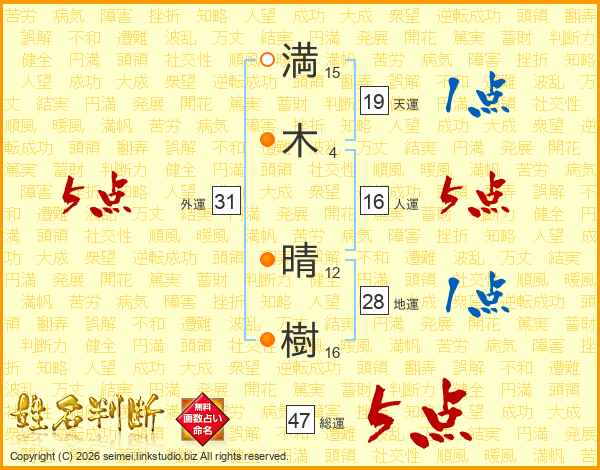 あなたの人生を表す1番重要な運勢です。生涯を通じて影響する総合運となり、主に50歳以降の晩年期に影響を及ぼします。苗字と名前の合計画数。