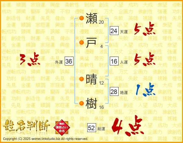 瀬(20画)戸(4画) 晴(12画)樹(16画)