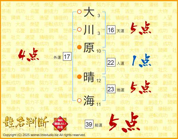 大(3画)川(3画)原(10画) 晴(12画)海(11画)
