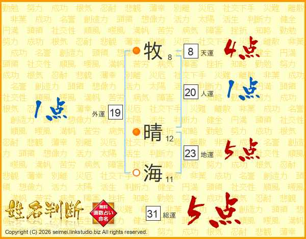 牧晴海さんの総運は31画の5点!