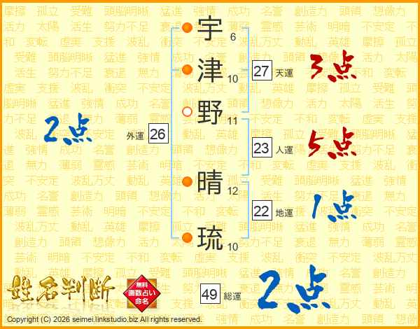 宇(6画)津(10画)野(11画) 晴(12画)琉(10画)