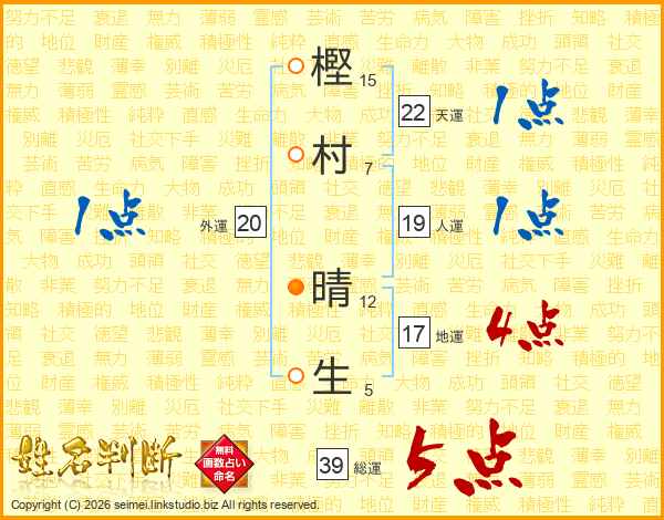 あなたの人生を表す1番重要な運勢です。生涯を通じて影響する総合運となり、主に50歳以降の晩年期に影響を及ぼします。苗字と名前の合計画数。