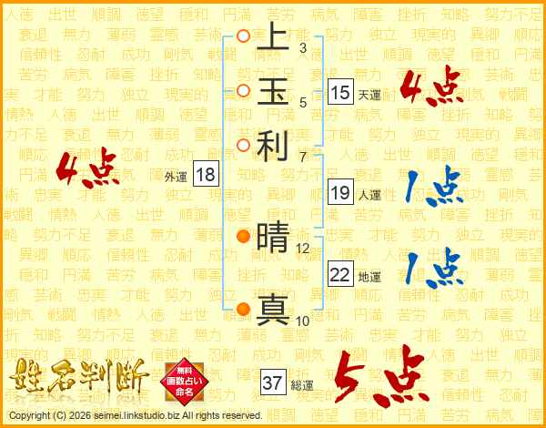 上(3画)玉(5画)利(7画) 晴(12画)真(10画)