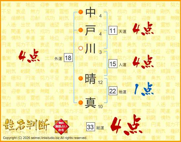 中(4画)戸(4画)川(3画) 晴(12画)真(10画)