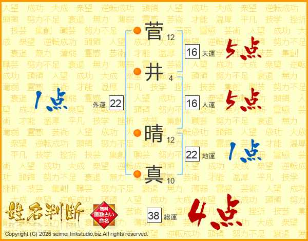 あなたの人生を表す1番重要な運勢です。生涯を通じて影響する総合運となり、主に50歳以降の晩年期に影響を及ぼします。苗字と名前の合計画数。