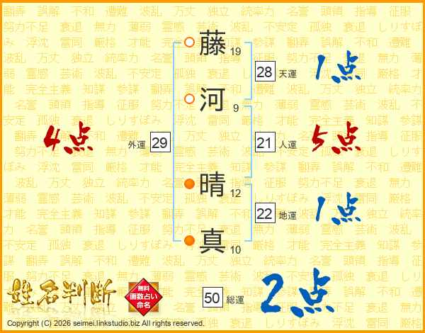 生活面を象徴する運勢です。外部から受ける影響力を表し、結婚運、家庭運や職場、環境への順応性を表します。総運から人運を引いた画数。姓や名が1文字の場合を除く。