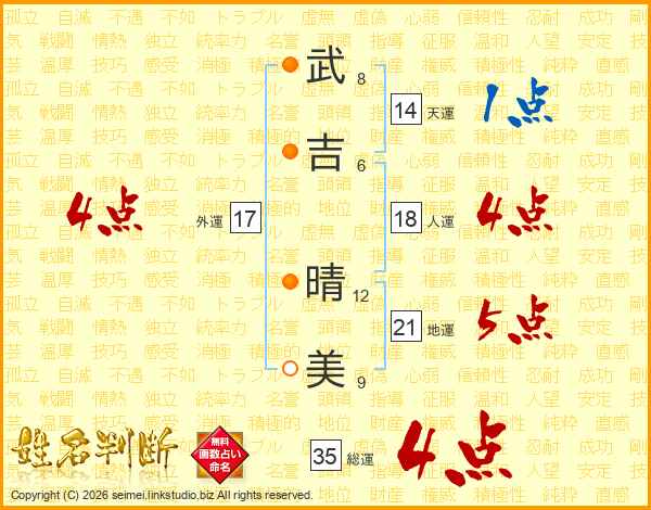 武(8画)吉(6画) 晴(12画)美(9画)