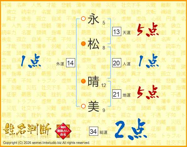 生活面を象徴する運勢です。外部から受ける影響力を表し、結婚運、家庭運や職場、環境への順応性を表します。総運から人運を引いた画数。姓や名が1文字の場合を除く。