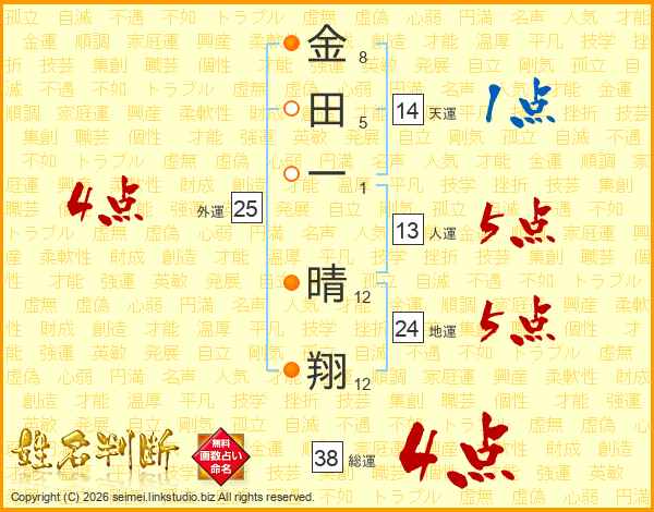 金田一晴翔さんの総運は38画の4点!