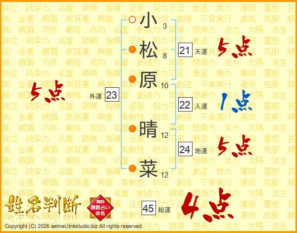 小(3画)松(8画)原(10画) 晴(12画)菜(12画)