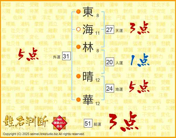東(8画)海(11画)林(8画) 晴(12画)華(12画)