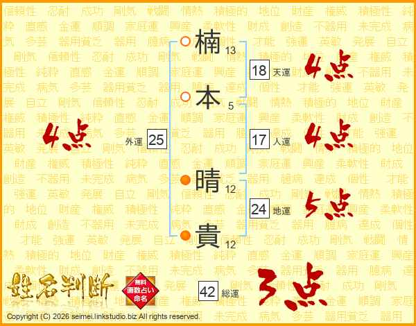 楠(13画)本(5画) 晴(12画)貴(12画)