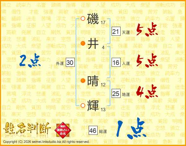 磯井晴輝さんの天運は21画の5点!