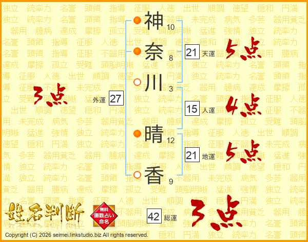 神(10画)奈(8画)川(3画) 晴(12画)香(9画)