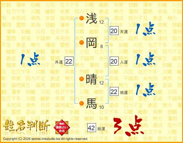 浅(12画)岡(8画) 晴(12画)馬(10画)