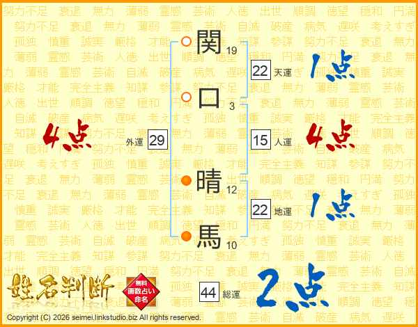 生活面を象徴する運勢です。外部から受ける影響力を表し、結婚運、家庭運や職場、環境への順応性を表します。総運から人運を引いた画数。姓や名が1文字の場合を除く。