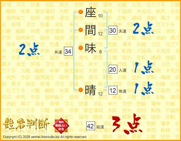 生活面を象徴する運勢です。外部から受ける影響力を表し、結婚運、家庭運や職場、環境への順応性を表します。総運から人運を引いた画数。姓や名が1文字の場合を除く。