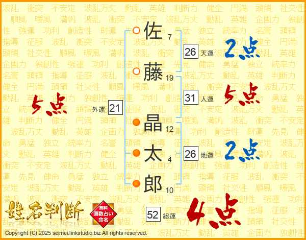 佐藤晶太郎さんの総運は52画の4点!