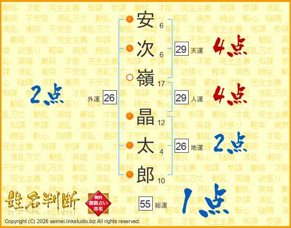 安(6画)次(6画)嶺(17画) 晶(12画)太(4画)郎(10画)